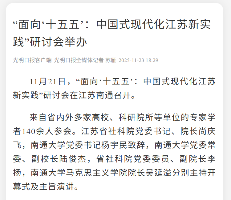 11月23日,光明日报客户端发布题为《“面向‘十五五’:中国式现代化江苏新实践”研讨会举办》的文章,聚焦我校举办的学术研讨会。新华网、江苏经济网、南通广播电视台、南通发布等媒体也进行了报道。