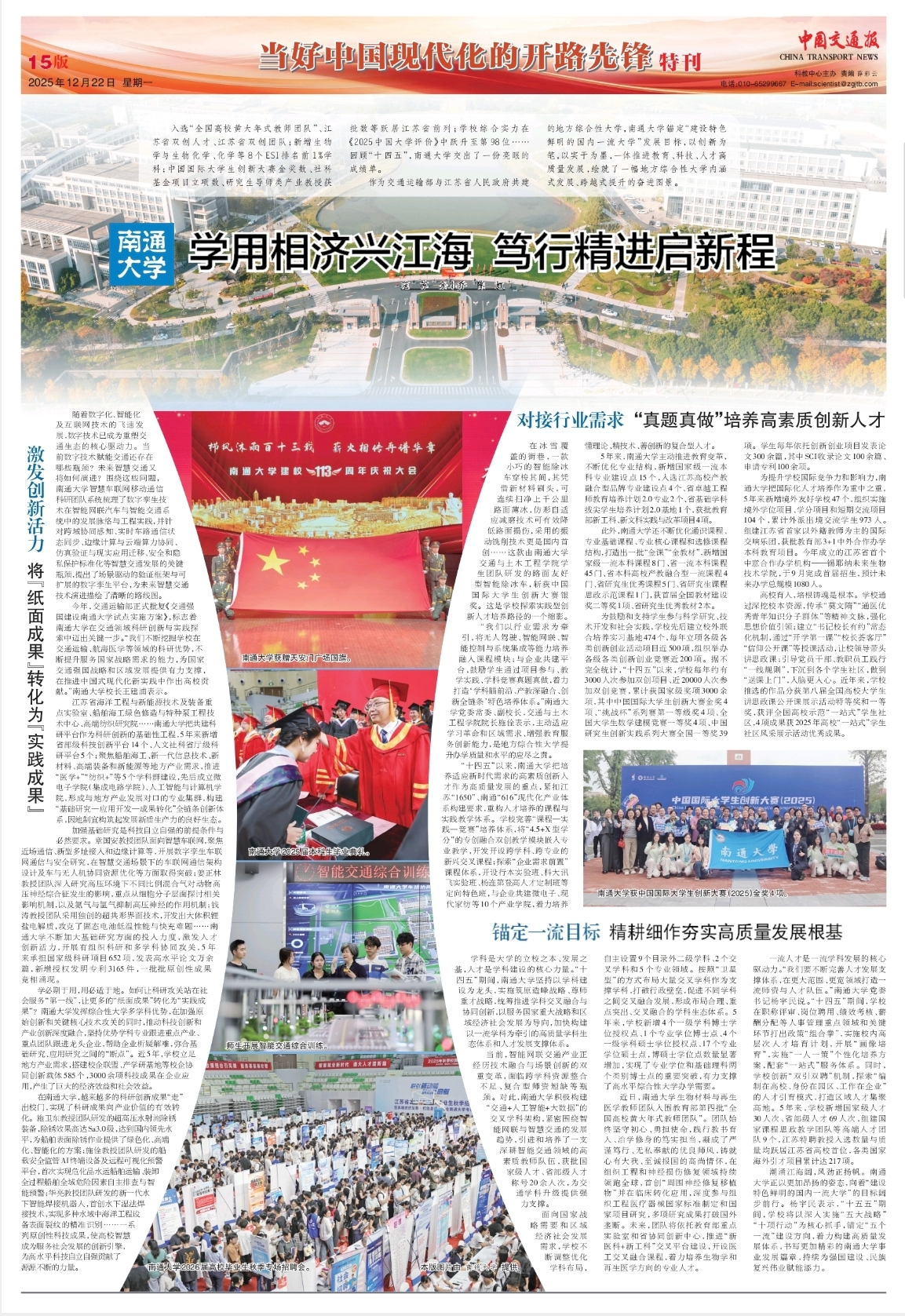 12月22日,《中国交通报》整版刊发题为《南通大学:学用相济兴江海 笃行精进启新程》的报道,关注我校“十四五”期间一体推进教育、科技、人才高质量发展的成果举措。中国交通新闻网、交通强国公众号同步报道。