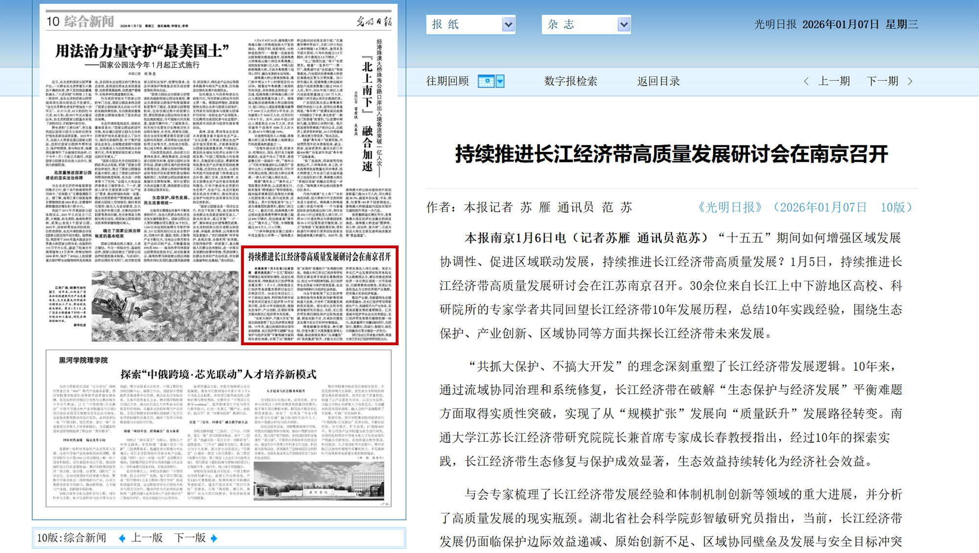 1月7日,《光明日报》刊发题为《持续推进长江经济带高质量发展研讨会在南京召开》的报道,聚焦由江苏省重点智库、我校江苏长江经济带研究院主办的持续推进长江经济带高质量发展研讨会。《中国社会科学报》、江苏广播电视台、交汇点新闻等媒体也进行了报道。