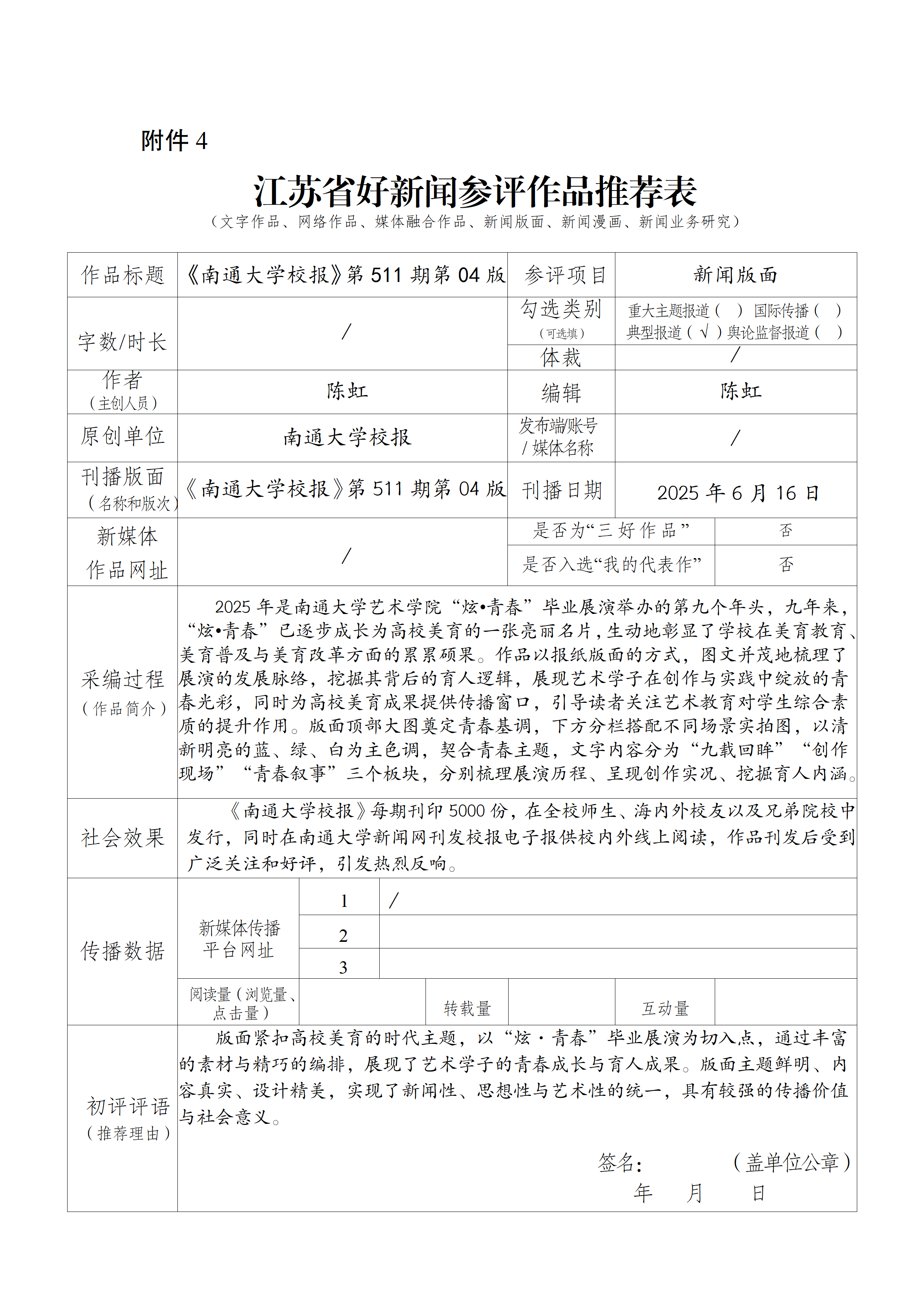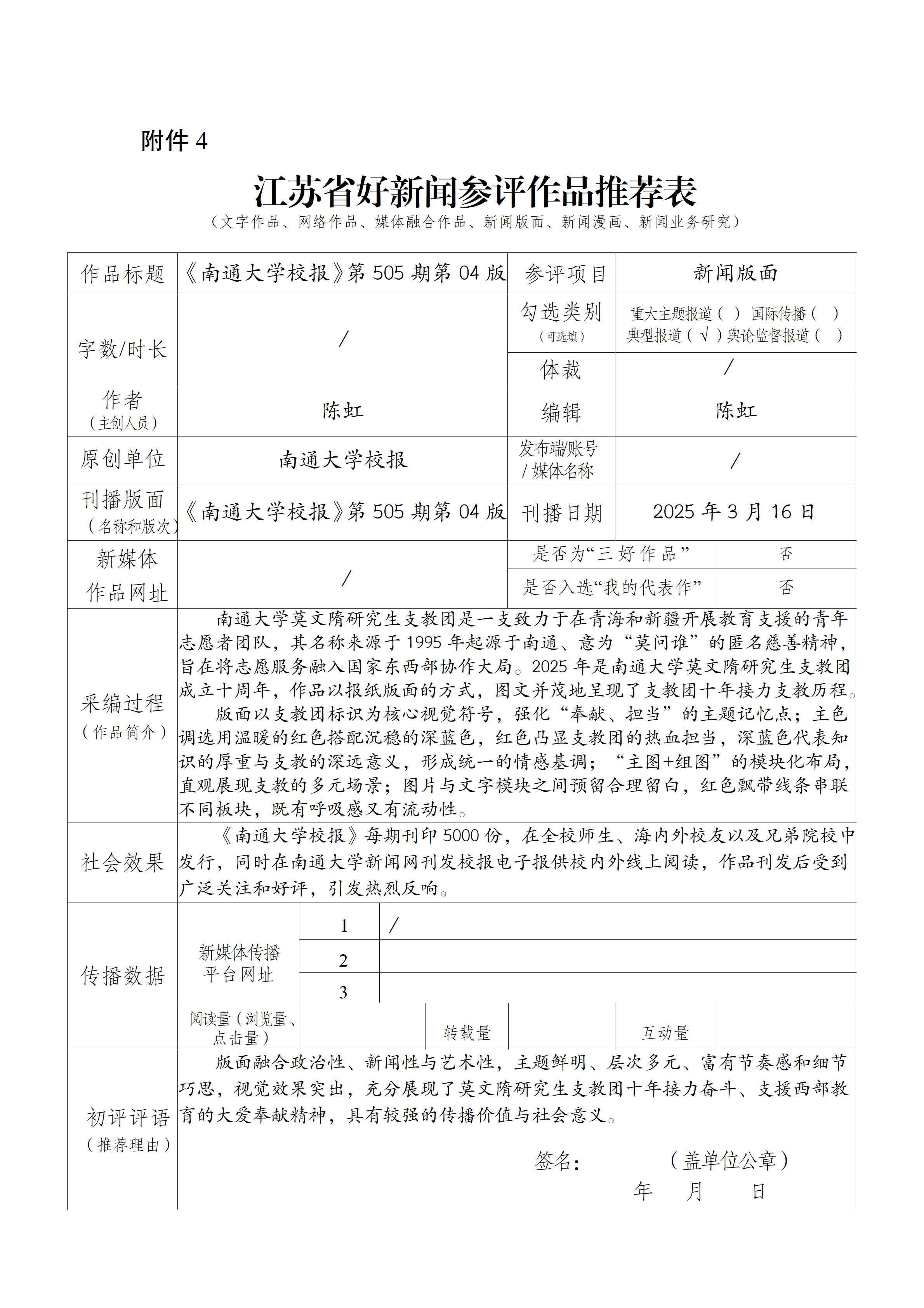 南通大学校报编辑部通过组织专家初评,产生拟推荐参评2025年度江苏省好新闻(新闻版面)作品。根据《江苏省好新闻评选办法》要求,现对推荐参评作品进行公示(见附件)。