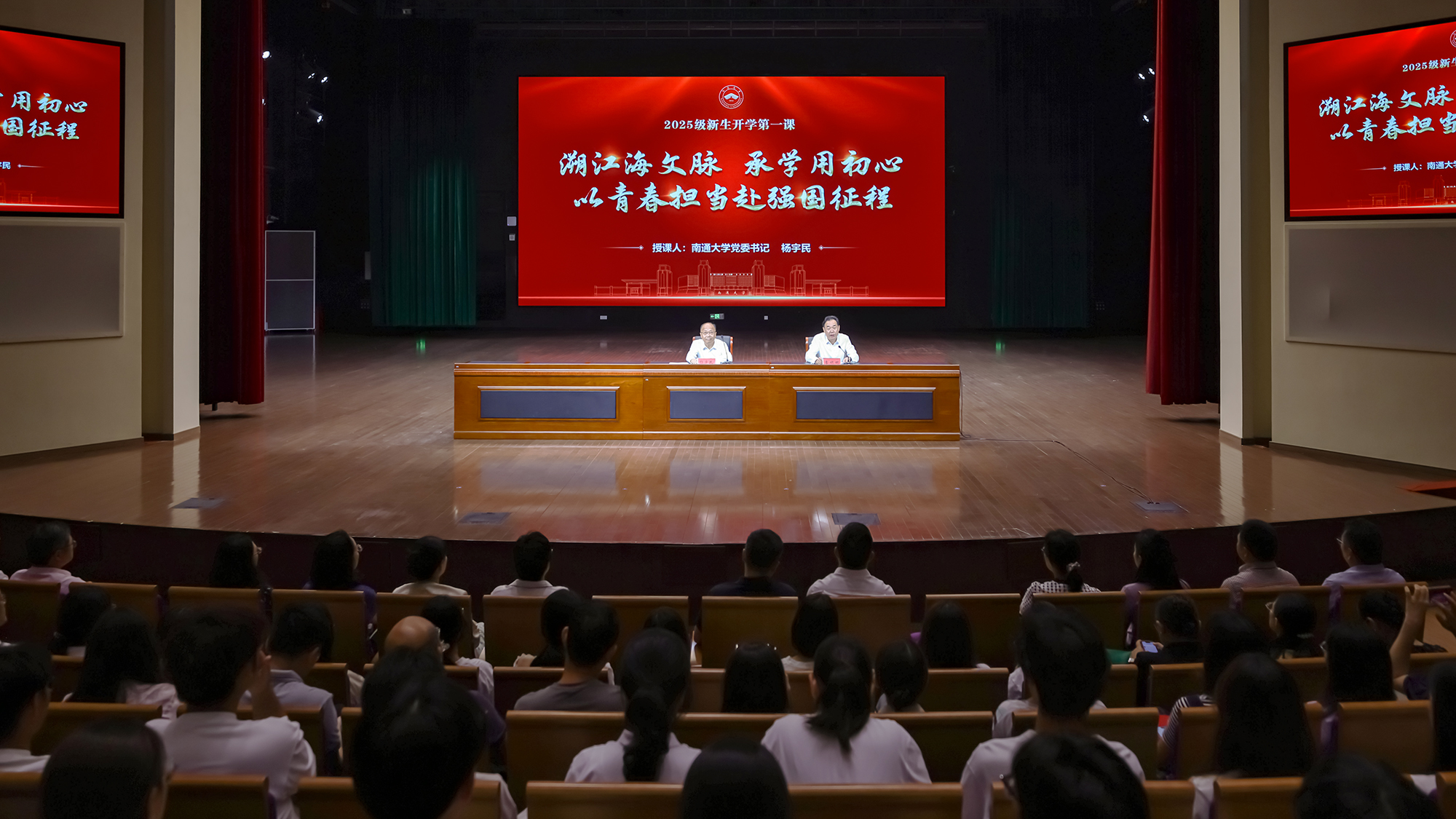 9月29日下午,校党委书记杨宇民以《溯江海文脉 承学用初心 以青春担当赴强国征程》为题,为全体2025级新生讲授“开学第一课”。校党委常委、副校长吉明明主持活动。校党委常委、宣传部部长陶锋出席活动。授课中,杨宇民用“一条主线、四个阶段”向同学们讲述了张謇教育理念和学校的发展历史,带领大家探寻“何为通大”的深厚底蕴,引导同学们深刻理解学校的办学根基与文化内核。他指出,“学必期于用,用必适于地”是张謇先生办学初心的高度凝练,是贯穿学校发展历程的办学理念,是学校与南通城市深度绑定、共生共荣的精神密码,也是通大学子求学成长的指南针。“祈通中西,力求精进”的校训是师生治学求学、为人履职的行动指南,承